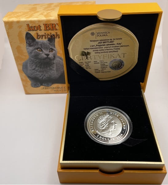 1 dolar Kot brytyjski 2014 r. - srebrna moneta kolekcjonerska, producent Mennica Polska S.A. na zlecenie Centralnego Banku Nowej Zelandii, stempel lustrzany, moneta w kapslu ochronnym, pudełku szkatułkowym i certyfikatem oraz dodatkowym ozdobnym pudełku kartonowym. Zdobiona drukiem cyfrowym, w oczach kota kryształki Swarovski Elements, stan zachowania menniczy