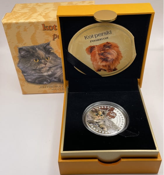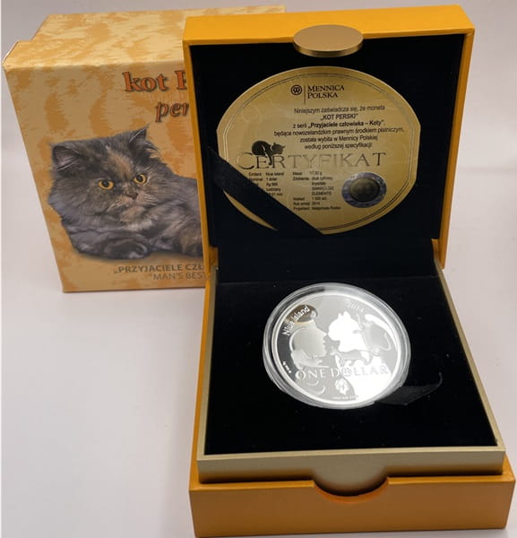 1 dolar Kot perski 2013 r. - srebrna moneta kolekcjonerska, producent Mennica Polska S.A. na zlecenie Centralnego Banku Nowej Zelandii, stempel lustrzany, moneta w kapslu ochronnym, pudełku szkatułkowym i certyfikatem oraz dodatkowym ozdobnym pudełku kartonowym. Zdobiona drukiem cyfrowym, w oczach kota kryształki Swarovski Elements, stan zachowania menniczy