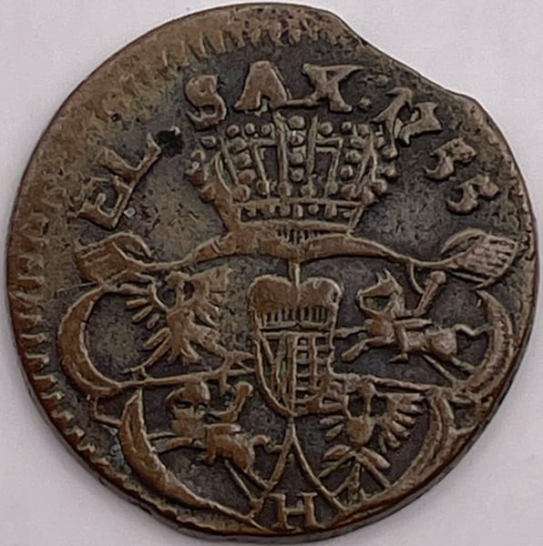 U góry monety napis EL SAX 1755, poniżej herb, a u dołu litera H