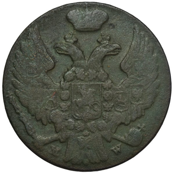 1 groszy Warszawa MW 1839 r. - monet z Królestwa Polskiego pod zaborem rosyjskim, stempel zwykły, stan zachowania 3 wersja bez kropki po cyfrach nominału.