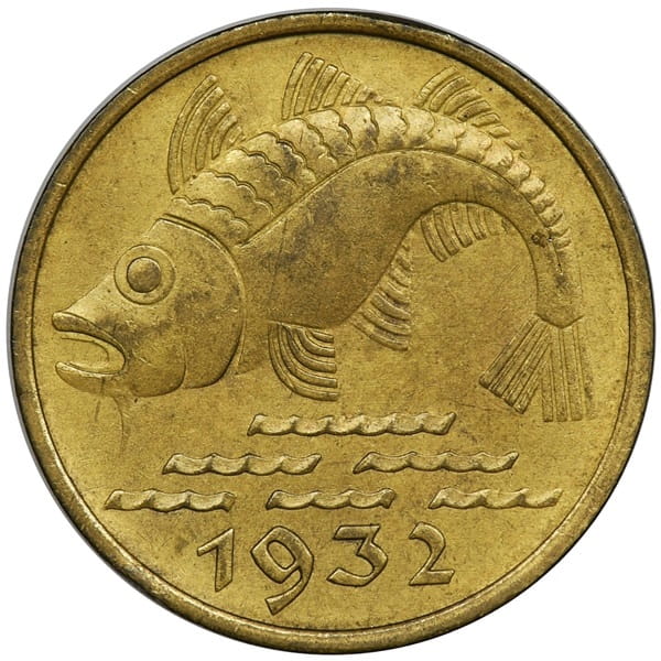 Na awersie monety u góry stylizowany wizerunek ryby dorsza, poniżej stylizowane linie fal w trzech rzędach. U dołu monety rok jej emisji 1932