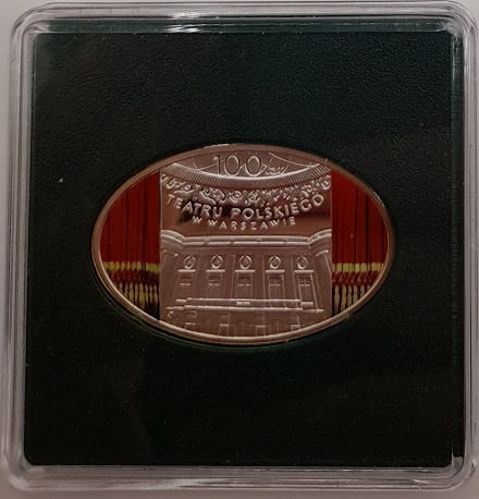 Na rewersie stylizowany fragment budynku Teatru Polskiego w Warszawie od frontu, po bokach kolorowa kurtyna. U góry monety na tle stylizowanego plafonu napis 100 lat, a poniżej w dwóch rzędach dużymi literami napisy: Teatru Polskiego / w Warszawie