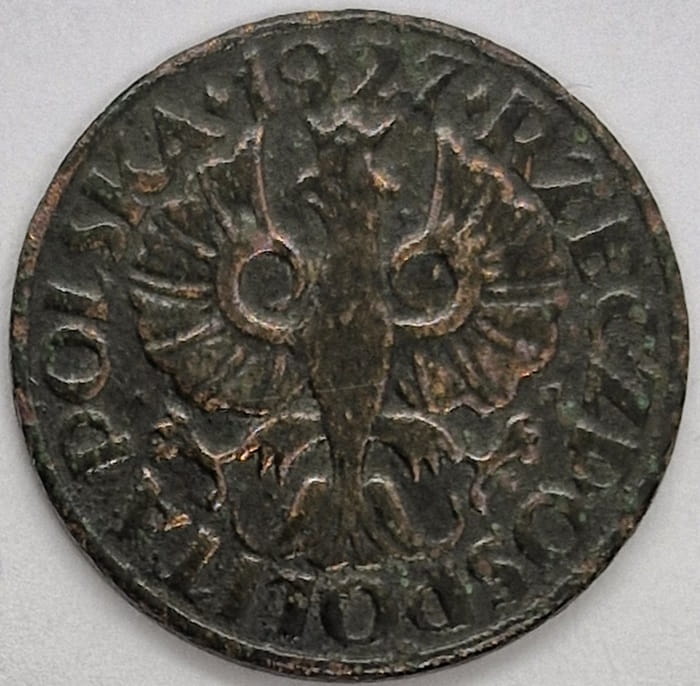 2 grosze 1927 r. - moneta obiegowa z okresu II Rzeczpospolitej Polskiej, metal brąz, emitent Bank Polski, producent Mennica Państwowa, stempel zwykły, stan zachowania 3 lakierowana