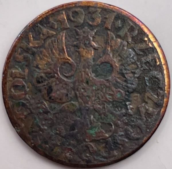 2 grosze 1931 r. - moneta obiegowa z okresu II Rzeczpospolitej Polskiej, metal brąz, emitent Bank Polski, producent Mennica Państwowa, stempel zwykły, stan zachowania -3/4, real foto