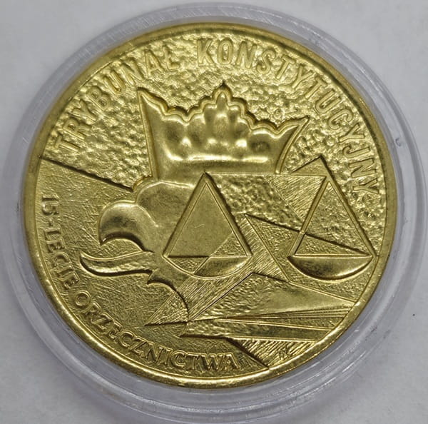 Na rewersie na pierwszym planie stylizowany wizerunek wagi i kart papieru, a jakby za nimi stylizowana głowa orła w koronie. W tle stylizowane dwa tła dzielące monetę po skosie na dwie równe części. Wokół rantu monety u góry napis: TRYBUNAŁ KONSTYTUCYJNY, a na dole przy rancie łukiem napis: 15-LECI ORZECZNICTWA.