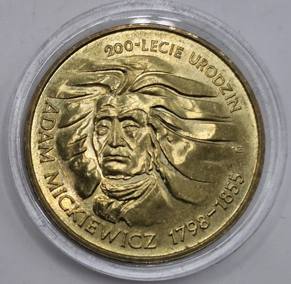Na rewersie stylizowany wizerunek głowy Adama Mickiewicza z bujnymi włosami rozbiegającymi się we wszystkich kierunkach. Wokół rantu monety u dołu napis: ADAM MICKIEWICZ 1798-1855, a u góry napis 200-LECIE URODZIN.