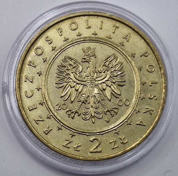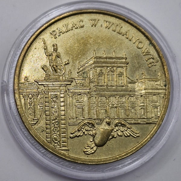 2 złote Pałac w Wilanowie 2000Moneta okolicznościowa z kategorii monety 2 zł emitent NBP - Narodowy Bank Polski Nordic Gold, producent Mennica Polska S.A. z serii Zamki i Pałace w Polsce, stempel zwykły, metal / stop CuAl5Zn5Sn1, średnica 27 mm. masa 8,15 gram. rok emisji 2000, wielkość emisji 500 000 sztuk, projektant rewersu Andrzej Nowakowski, moneta w kapslu ochronnym, stan zachowania 1/-12 zł WilanówAwers monetyNa awersie widnieje orzeł w koronie godło ustanowione dla Rzeczypospolitej Polski wpisany w koło z ozdobnymi lilijkami. Po bokach orła rozdzielona data emisji monety 20 - 00. W otoku napis dużymi literami: Rzeczpospolita Polska oddzielony po obu stronach perełką od nominału monety w zapisie ZŁ 20 ZŁ. Pod lewą łapą orła znak mennicy: m/wRewers monetyNa rewersie widnieje zachodnia cześć pałacu w Wilanowie. Poniżej orzeł z herbem Jana III Sobieskiego na piersi. W lewej części monety fragment bramy pałacu a na niej rzeźba Mars Sarmacki. W górnej części monety półkolem napis: PAŁAC W WILANOWIEBok monetyNa boku napis dużymi literami: Narodowy Bank PolskiPałac w WilanowieŹródło: Opracowanie własne