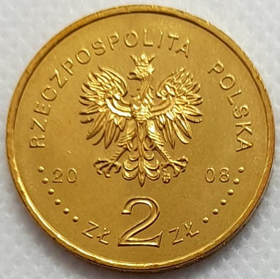 Na awersie widnieje orzeł w koronie ustanowiony dla godła Rzeczypospolitej Polskiej. Pod orłem rok emisji monety: 2008, poniżej nominał monety w zapisie: ZŁ 2 ZŁ. U góry półkolem napis dużymi literami: Rzeczpospolita Polska z obu stron oddzielony sześcioma koralikami od nominału monety. Pod lewą łapą orła znak mennicy: m/w