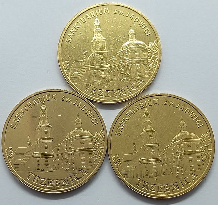 Na rewersie z lewej strony stylizowany wizerunek fasady Bazyliki pod wezwaniem św. Jadwigi i św. Bartłomieja. Z prawej strony monety fragment pocysterskiego kompleksu klasztornego w Trzebnicy. Na dole monety przy rancie napis: TRZEBNICA, u góry monety przy rancie napis: SANKTUARIUM św. JADWIGI.