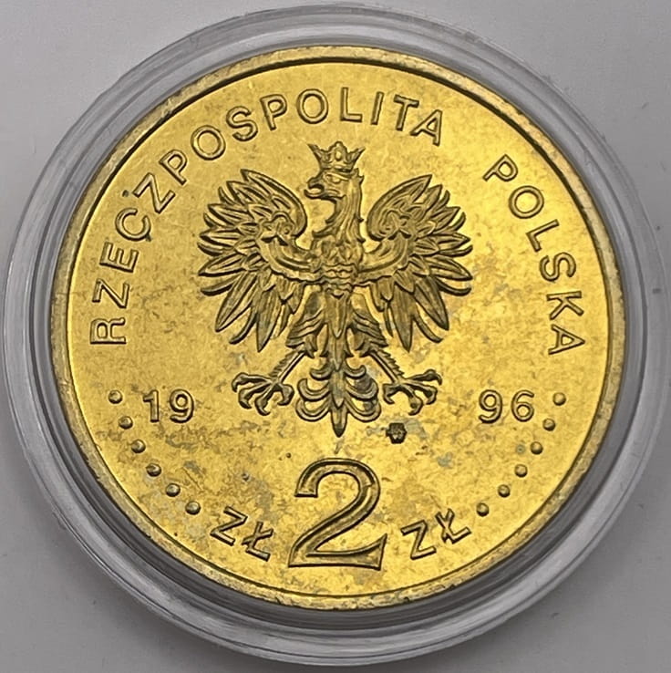 Na awersie orzeł w koronie ustanowiony dla godła Rzeczypospolitej Polskiej, po bokach orła rok emisji monety: 1996. Pod orłem nominał monety w zapisie: ZŁ 2 ZŁ. W otoku monety napis dużymi literami: Rzeczpospolita Polska poprzedzony oraz zakończony sześcioma perełkami. Pod lewą łapą orła znak mennicy: m/w