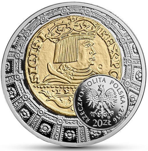 20 złotych Dukat Zygmunta Starego 2016 r. - srebrna moneta kolekcjonerska 20 złotych NBP - Narodowy Bank Polski, producent Mennica Polska S.A., z serii Historia monety polskiej., stempel lustrzany oraz selektywne złocenie. moneta w kapslu ochronnym, stan zachowania L/L