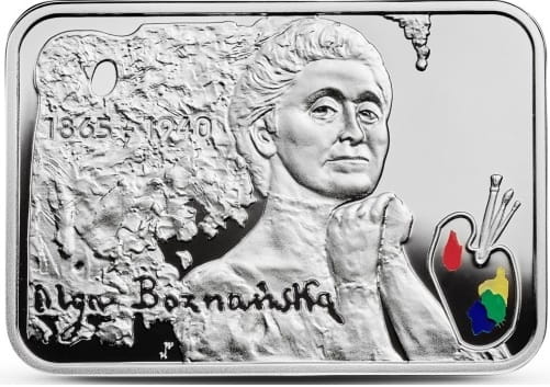 20 złotych Olga Boznańska 2016 r. - srebrna moneta kolekcjonerska - Narodowy Bank Polski, producent Mennica Polska S.A., z serii Polscy malarze XIX/XX w., stempel lustrzany. moneta w kapslu ochronnym, stan zachowania - L widoczną mikroryski i smugi na lustrze, zdjęcie przykładowe NBP