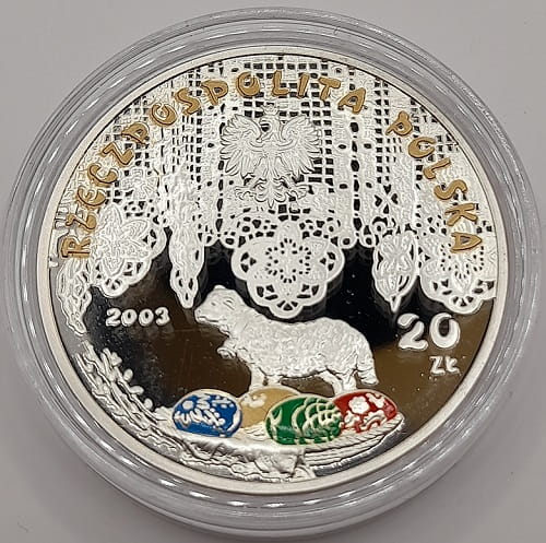 Na awersie u góry orzeł w koronie, godło ustanowione dla Rzeczpospolitej Polski. Nad orłem farbą w kolorze złotym napis półkolem przy rancie: RZECZPOSPOLITA POLSKA, a poniżej nominał monety 20 zł. Po drugiej stronie rok emisji monety 2003. W tle od góry ozdobne firanki, a pod nimi baranek oraz pisanki wykonane w kolorach: niebieskim, złotym, zielonym i czerwonym. Pod lewą łapą orła znak mennicy: m/w