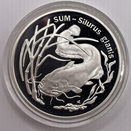 Na rewersie monety widnieje płynący wśród roślinności dorosły osobnik suma. W górnej części monety półkolem napis: SUM - Silurus glanis. W prawym dolnym miejscu, przy wąsie suma inicjały projektanta monety NR