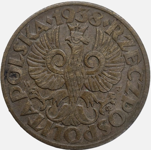 5 groszy 1939 r. - moneta obiegowa z okresu II Rzeczpospolitej Polskiej, metal brąz, emitent Bank Polski, producent Mennica Państwowa, stempel zwykły, stan zachowania 3, real foto