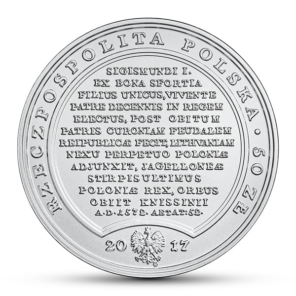 Na awersie monety czytamy nieznacznie skrócony tekst z rewersu medalu (w tłumaczeniu): Jedyny syn Zygmunta I i Bony Sforzy, za życia ojca, w wieku lat dziesięciu obrany na króla, po śmierci ojca uczynił Kurlandię lennem Rzeczypospolitej, Litwę przyłączył wiecznym węzłem do Polski, ostatni król Polski z rodu Jagiellonów. Umarł bezdzietny w Knyszynie Roku Pańskiego 1572, mając lat 52, w 24. roku panowania, dnia 18 lipca.