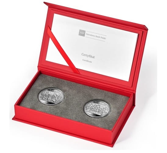 2 x 10 zł Hołd ruski hołd pruski - srebrne monety kolekcjonerskie w pudełku NBP, producent Mennica Polska S.A., stempel lustrzany, monety w czerwonym oryginalnym pudełku, stan zachowania menniczy