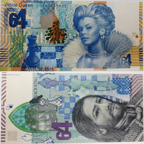 Odmiennie niż w przypadku awersu, tu grafika jest w orientacji pionowej. Po lewej stronie powyżej środka liczba 64 oraz u dołu po prawej stronie. W tle stylizowane pola szachownicy oraz kontury pionków szachowych. U dołu z lewej strony stylizowany wizerunek mężczyzny - symbol czarnego króla, co sugeruje napis nad pionkami obok czarnego kruka: Black King. U góry banknotu obok okna które jest wykonane farbą widoczną pod świtem UV, widnieją symbole pionków szachowych "król" i "królowa"