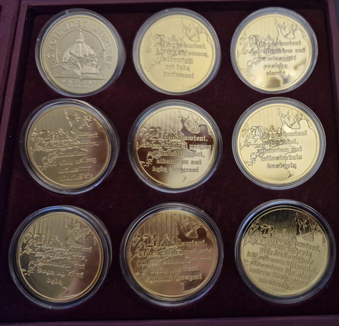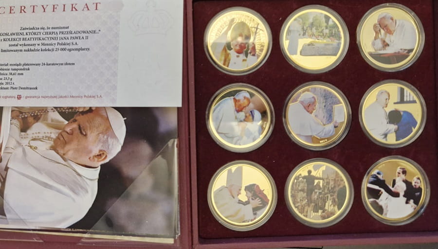 Kolekcja beatyfikacyjna Jana Pawła II 2012 r. - Zestaw 9 numizmatów o średnicy 38,61 mm jak monety 20 złotowe. Numizmaty wykonane z miedzi platerowane 24-karatowym złotem. Do każdego numizmatu jest certyfikat oraz zbiorcze pudełko, producent Mennica Polska S.A