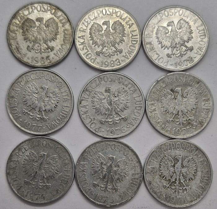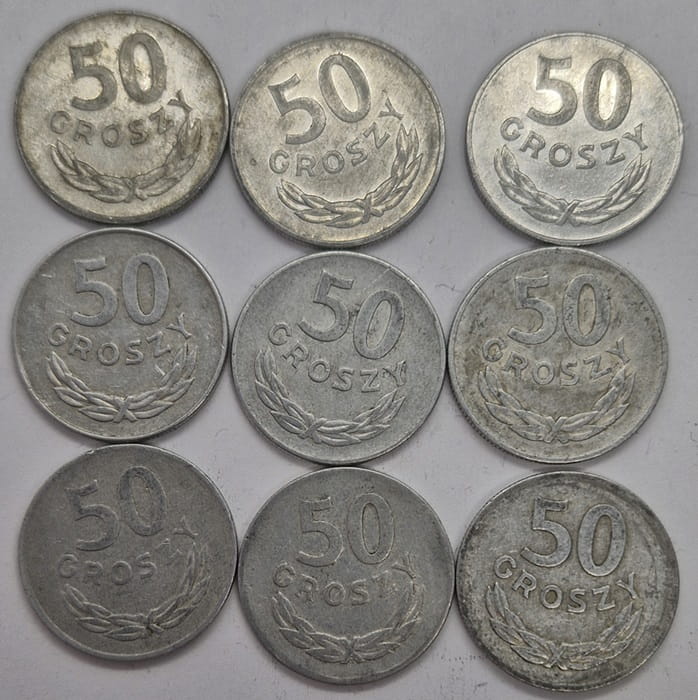 W zestawie 9 monet o nominale 50 gorszy z Polskiej Rzeczpospolitej Ludowej z rocznikami: