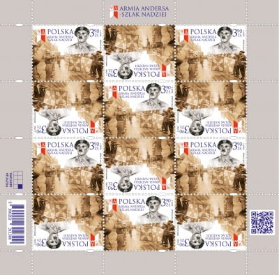 Arkusz Armia Andersa Szlak Nadziei 2023 r. - arkusz znaczków kolekcjonerskich o ograniczonym nakładzie pojedynczego znaczka 144 000 sztuk, emitent Poczta Polska, seria Armia Andersa Szlak Nadziei, stan zachowania nowy